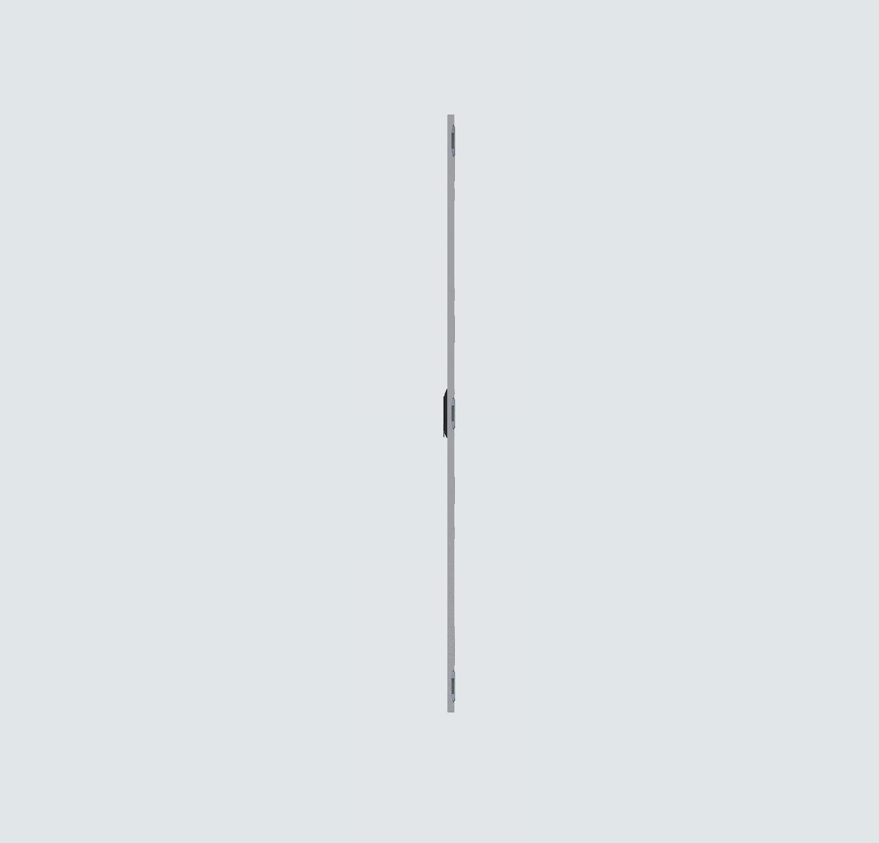 Camlı Kapı, kabin içeriğini (sayaçlar, göstergeler, paneller) gözlemlemek ve kontrollü erişim sağlamak amacıyla tasarlanmıştır. 1.5 mm galvaniz sac ve 4 mm temperli camdan üretilmiş olup, elektrostatik toz boya (RAL 7035, Açık Gri) yüzeyi ile dayanıklılık ve estetik görünüm sunar. Gizli menteşe tasarımı, kabin ön iskeletini tamamen kapatarak güvenli bir yapı sağlar. Dökme contalı uygulamada IP54 koruma sınıfına uygundur. 3 noktalı ispanyolet kilit sistemi, cam altında özel conta ve kapı içi cam destek sacları ile sağlam ve güvenli kullanım imkânı sunar. Montaj, gizli menteşelerle vidalı ve basittir.