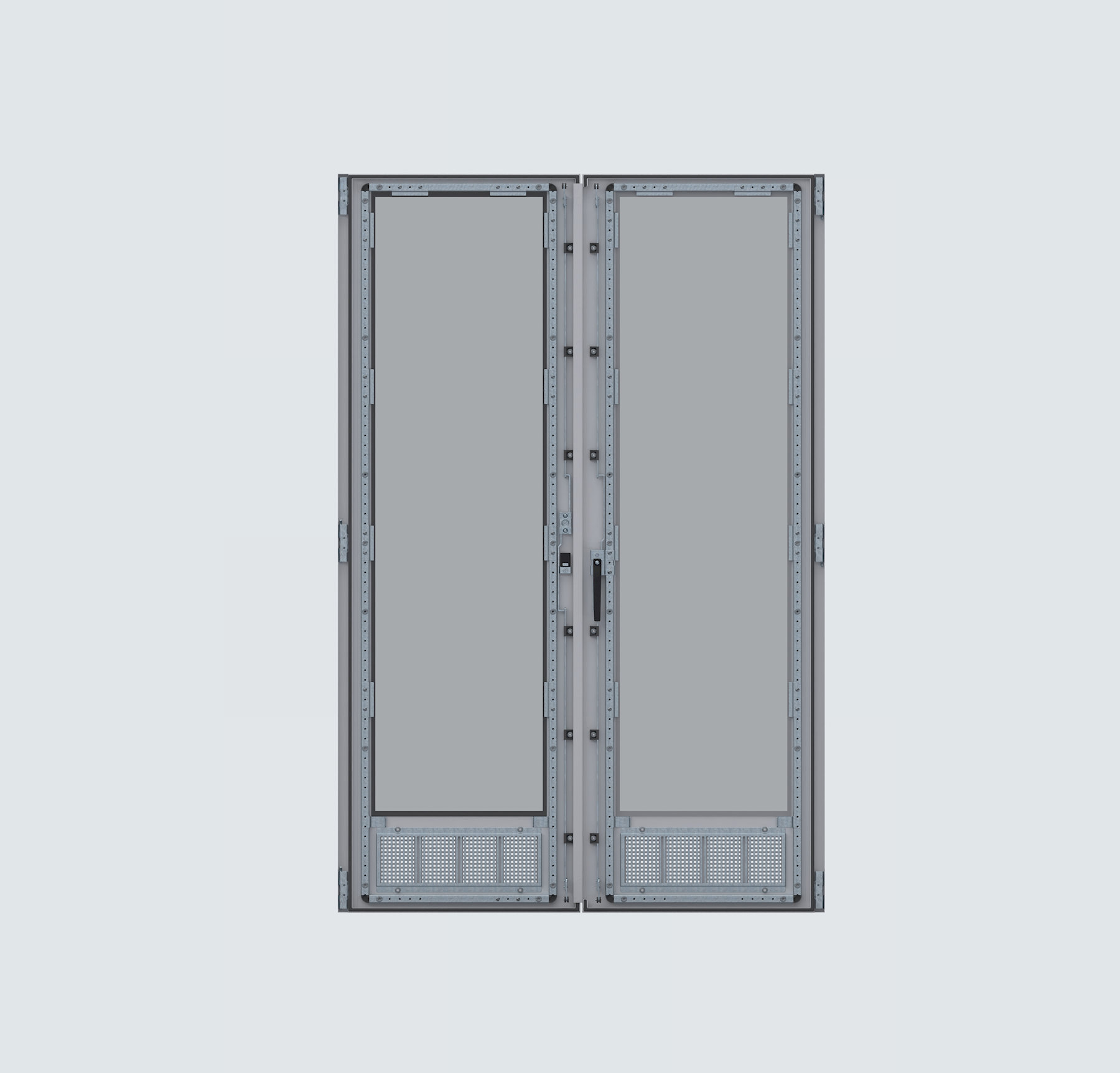 Camlı Bindirme Kapı, kabin içeriğini gözlemlemeyi sağlarken aynı zamanda hava sirkülasyonu ve filtreleme imkânı sunmak için tasarlanmıştır. 1.5 mm galvaniz sac ve 4 mm temperli camdan üretilmiş olup, filtre bölümü için özel filtre kullanılmıştır. Gizli menteşe tasarımı, kabin ön iskeletini tamamen kapatarak güvenli bir yapı sağlar ve ek filtre yarıkları ile hava akışını destekler. Dökme contalı uygulamada IP54 koruma sınıfına uygundur. 3 noktalı ispanyolet kilit sistemi, cam altında özel conta ve kapı içi cam destek sacları ile sağlam ve güvenli bir kullanım sunar. Filtreler kolayca temizlenebilir veya değiştirilebilir. Kapı yüzeyindeki pasif havalandırma giriş/çıkışları, kabin içindeki hava sirkülasyonunu destekler. Montaj, gizli menteşelerle vidalı ve basittir.