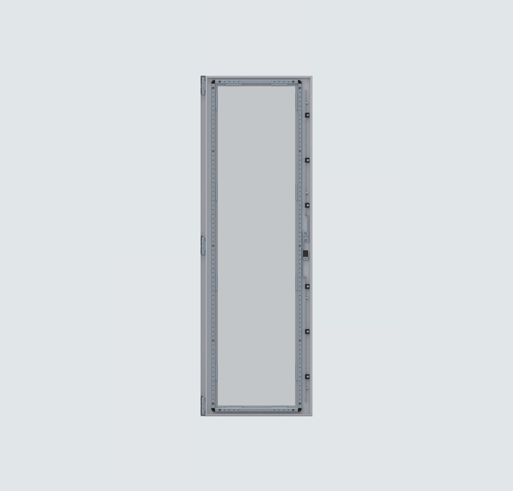 CAMLI KAPI, kabin içeriğini gözlemleme ve güvenli erişim sağlama amacıyla tasarlanmıştır. 1.5 mm galvaniz sac ve 4 mm temperli camdan üretilen bu kapı, dayanıklı ve estetik bir yapı sunar. Elektrostatik toz boya (RAL 7035) kaplama ile yüzey korunmuş ve uzun ömürlü bir kullanım sağlanmıştır. Gizli menteşe tasarımı, kabin ön iskeletini tamamen kapatarak hem şık hem de güvenli bir görünüm kazandırır. Dökme contalı uygulama sayesinde IP54 koruma sınıfına uygunluk sağlanır. Cam altında kullanılan özel conta ve kapı içi cam destek sacları camın kırılmaya karşı dayanıklılığını artırır. Kapı, 3 noktalı ispanyolet kilit sistemi ile donatılmış olup montajı gizli menteşelerle vidalı olarak kolayca yapılabilir.