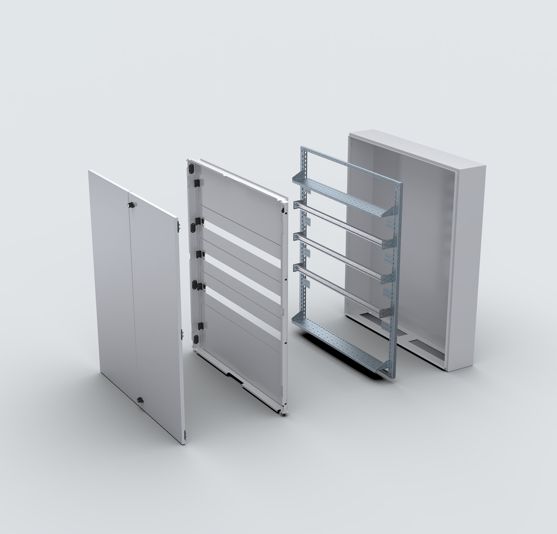 Dahili tip kabin; IK10 darbe dayanımı ve doğal soğutma özelliğine sahiptir. 1.2 mm galvaniz gövde, 1.5 mm iç profiller ve 1.2 mm galvaniz ön kapıdan oluşur. RAL 7035 elektrostatik toz boyalıdır ve iki noktalı çeyrek dönüşlü/kollu kilit sistemi ile donatılmıştır.