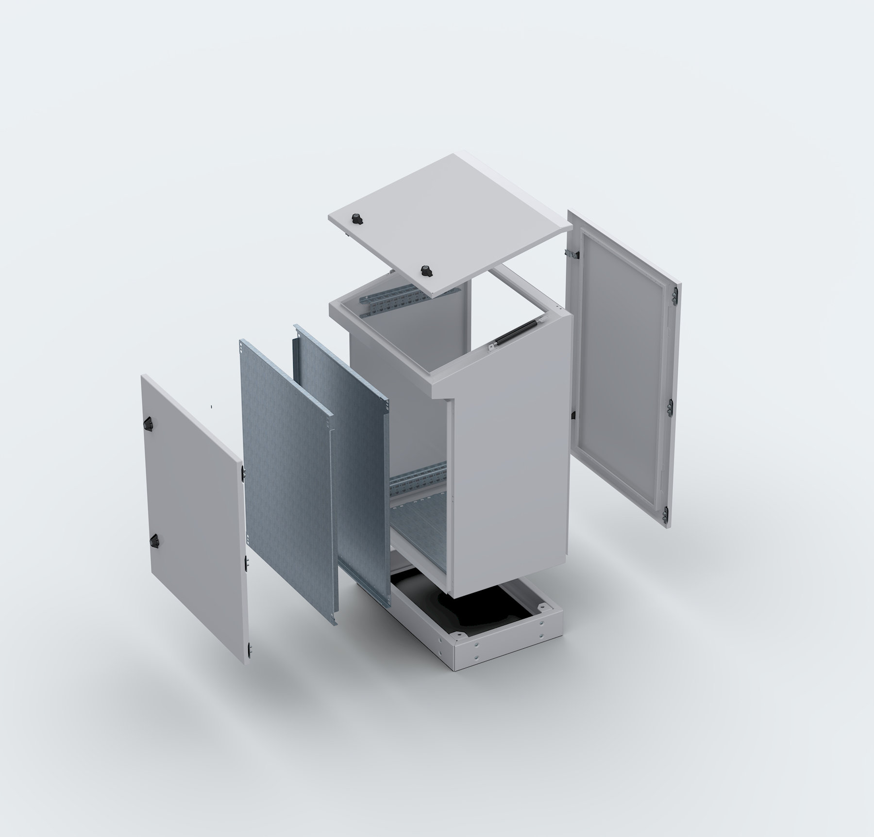 Ön kapı menteşeli ve gizli menteşe sistemine sahip olup, poliüretan conta ile sızdırmazlık sağlanmaktadır. Kilit sistemi, iki noktadan çeyrek dönüşlü anahtarlı kilit ile güvenli erişim sunar. Pult yüzeyi, operatör ergonomisine uygun olarak eğimli tasarlanmış olup, buton ve gösterge montajına imkan tanır. Kablo girişi ise parçalı kablo giriş plakaları aracılığıyla vidalı şekilde sağlanmaktadır, böylece düzenli ve güvenli kablo yönetimi mümkün olur.
