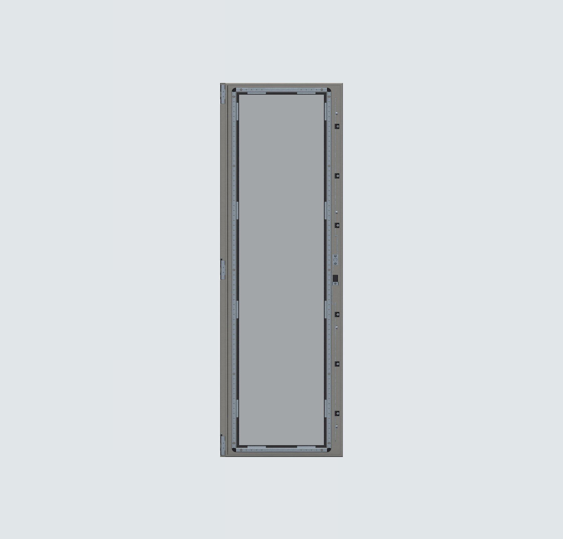 Camlı Kapı, kabin içindeki sayaç, gösterge ve panellere güvenli erişim sağlamak ve gözlem imkanı sunmak için tasarlanmış bir bileşendir. Paslanmaz AISI304 veya AISI316 malzemeden üretilmiş olup 1.5 mm sac ve 4 mm temperli cam kullanılmıştır. Lak kaplama yüzeyi estetik ve dayanıklıdır. Gizli menteşe tasarımı, kabin ön iskeletini tamamen kapatarak temiz ve profesyonel bir görünüm sağlar. Dökme contalı uygulamada IP54 koruma sınıfına uygundur ve 3 noktalı ispanyolet kilit sistemi ile güvenlik artırılmıştır. Cam altında bulunan özel conta ve kapı içi destek sacları, camın kırılmaya karşı dayanıklılığını artırır. Montaj, gizli menteşelerle vidalı ve basit şekilde yapılır.